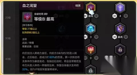 之所以点满血之渴望这个技能并不是因为它的伤害如何出彩,而是因为该技能可以按照自身的血量百分比进行恢复,虽然在PVP地区中恢复效果将会减半,但不得不承认的一点就是恢复量依旧可观!所以在个人眼中它就是一个恢复技,自然在释放时我们要瞅准时机争取一击即中。
