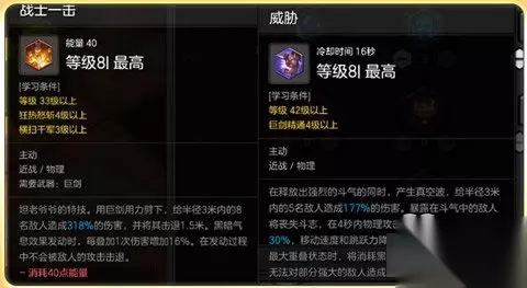 威胁与战士一击可以当做连携技看待,虽然大家都知道战士一击的瞬间伤害可观,但是其命中率在竞技对抗中并不高!而如何让灵敏机动的目标更容易被战士一击打中呢?答案自然是降低目标移动力咯!那么满技能下的威胁可降低30%的移动速度和跳跃力正好迎合了战士一击的需求,从而让狂战士的战士一击可以更多次的命中目标,并且威胁可降低目标角色30%的伤害,在一定程度上也算起到了防御的效果。