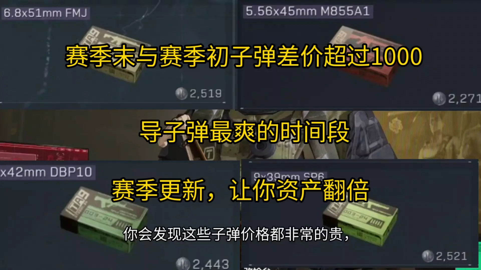 这是《三角洲》的游戏赚钱攻略,介绍倒子弹的赚钱方法,提及5.56x45mm M855A1、5.7x28mm SS193等子弹的保本价、售卖价,靠倒这类子弹单日可赚2000万哈弗币,相关信息也会在粉丝群发布。