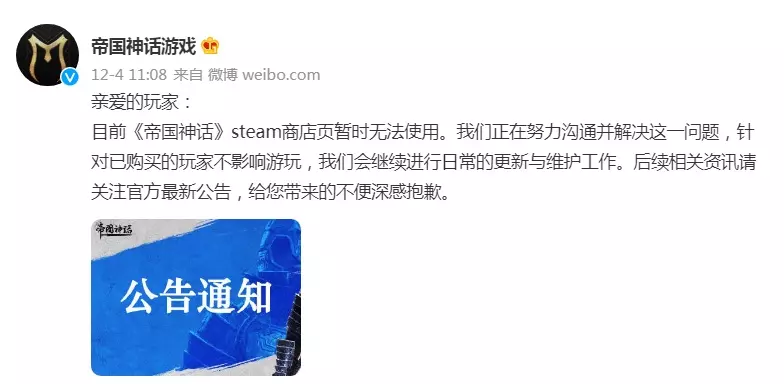 帝国神话下架怎么回事 【官方通知】 虽然无法购买,但已购买的玩家不影响游玩。 亲爱的玩家: 目前《帝国神话》steam商店页暂时无法使用。我们正在努力沟通并解决这一问题,针对已购买的玩家不影响游玩,我们会继续进行日常的更新与维护工作。后续相关资讯请关注官方最新公告,给您带来的不便深感抱歉。