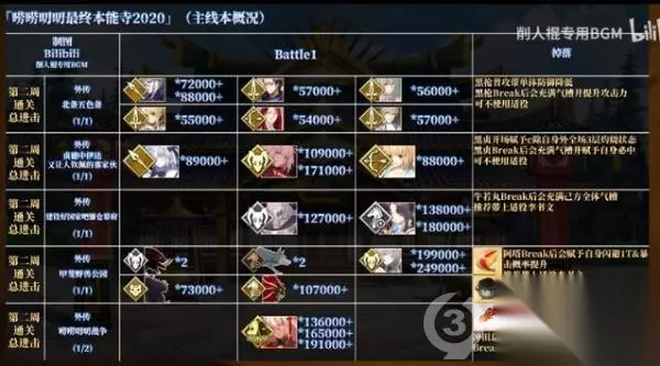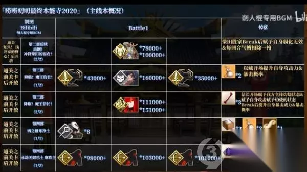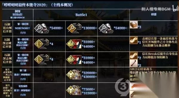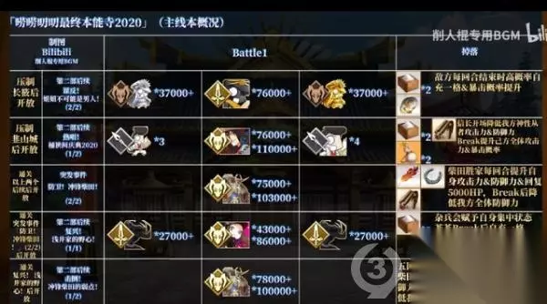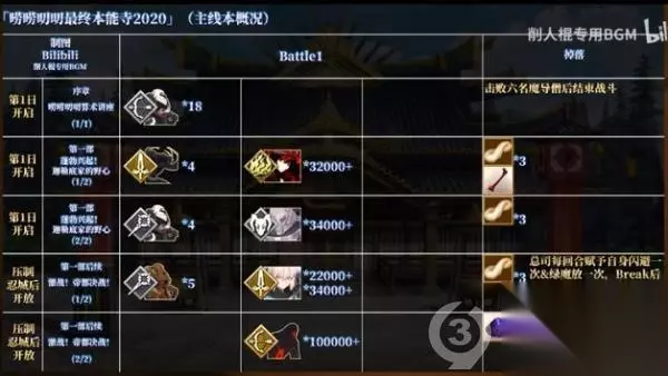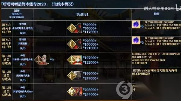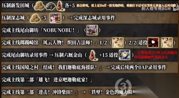 t15_2-t15_1:9.0 标签: 本能寺 FGO近期开启了最终本能寺的复刻活动,本篇攻略主要是带大家回顾下玩法,以及提供主线剧情关卡的信息与推进流程。详细攻略流程将以图文形式供玩家们参考,感兴趣的小伙伴一起了解一下吧。 简述下活动的整体玩法,最终本能寺的机制与SLC;类游戏相似,我们的目的就是占领各种要塞和土地资源,并不断出产军备向外扩张,最终一统天下。 在这次的活动中,许多关卡都需要消耗军备才能进行攻略,所以我们要先去压制一些城池,以及资源点提升我方军备的产能。 大地图左边的加成代表我们一回合能出产的军备数量,占的地方越多,这个粮草、火药、铁以及QP的加成也就会越多。 每当我们进行一次标有军备生产的战斗关卡,也就是完成Free本或压制本,就相当于按下了下一回合的按钮。 完成战斗后就能根据产能获得相应数量的军备,未被压制的区域都会设置守军,部分守军会有一些非常变态的技能。 强行攻略会被锤得很惨,所以这时就需要带上在攻略途中录用到的各种家臣,也就是系统助战。通过主线以及一些录用本,我们能解锁一些系统助战的英灵。 他们的本体虽然没有什么过人之处,但却能克制部分区域的敌人,进入关卡后在助战界面会显示适役标注。 带上适役家臣就能把这些超变态的关卡弱化到jio打的程度,例如六厩金山里面的nobu有7回合的100%攻击耐性。 以及一击秒人的超高攻击力,此时助战系统的家臣库丘林后他会给我方全体上一个5次闪避5次战续的Buff,我们拖到7回合后,就能一波清掉这些nobu了。