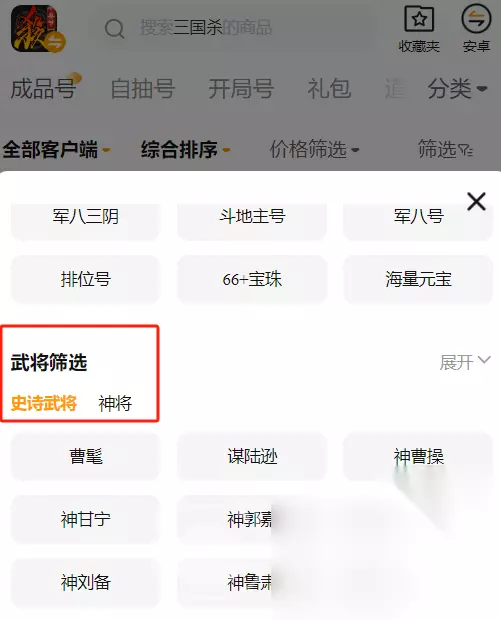 3、武将可选 另外商品中有一些强大的武将可供我们挑选,这时候我们只需要在筛选栏目中直接勾选一个我们需要的武将。如何挑出拥有该武将的相应账号,所以对于喜爱某些武将的朋友来说,而且选一个更适合高性价比号,如此就可以以他为核心打造队伍。