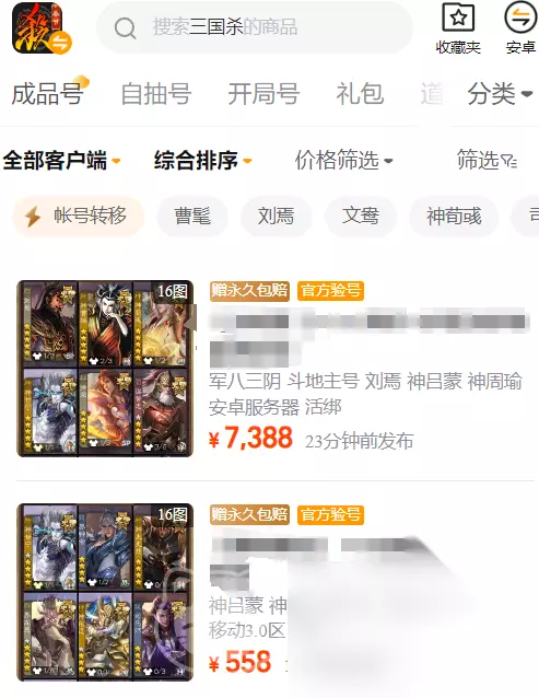 许多新玩家想入坑三国杀,但却不知道三国杀账号去哪买好?毕竟该游戏已经出了很久了,如果没有买号的话就很难跟得上其他人的节奏,自己也没有时间和金钱去购买如此多的卡牌。所以我们可以前往交易猫中,可随心挑选你所需要的三国杀账号,从而满足你的各方面需求。