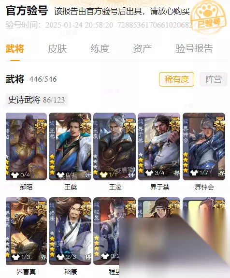 2、官方验号 若大家对想要购买的账号不放心的话,也可以选择购入一些支持官方验号的商品。这上面就会仔细通过官方验证其中所含有的财产和道具,而且真实性非常高,几乎不可能出错。让买家就可以放心入手,能够一目了然的看清账号中有哪些财产和信息。