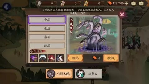 之后我们再选择业原火副本,当有业原火挑战券时,点击相应的有挑战券的业原火副本,点击挑战,点击挑战的同时立马切换下方按钮由业原火到八岐大蛇。 这时我们就会进入御魂副本1层里面挑战,而最终获得的奖励,却是业原火副本的奖励,而且这个方法竟然挑战券和体力都不消耗!一层御魂本打多快可想而知!实在是人神共愤!