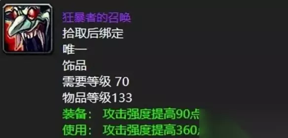 2、狂暴者召唤 需要等级:70 物品等级:133 装备属性:攻击强度提高90点。在战斗时攻击强度提高360点,持续20秒, 解析:非常强势的一个物理系的爆发饰品,猎人使用可以完美搭配任何的天赋,超高的攻击强度在战斗时可以应对大部分敌人。