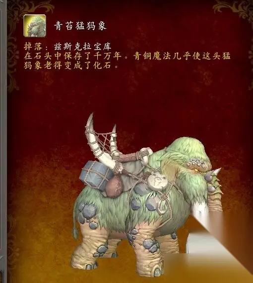 凑齐下面的道具就可以合成了: 奇怪的石球+黑龙碎鳞=极其普通的蛋 极其普通的蛋+少量的蓝龙魔法=被魔法改变的蛋 被魔法改变的蛋+恒燃红玉之煤=内容未知的蛋 内容未知的蛋+微量青铜之尘=沉睡的远古猛犸象 沉睡的远古猛犸象+翡翠巨龙胸针=坐骑:青苔猛犸象 如果以上道具30把钥匙都用完了,还没开出来,那么就只能等下个CD继续来开箱子啦!