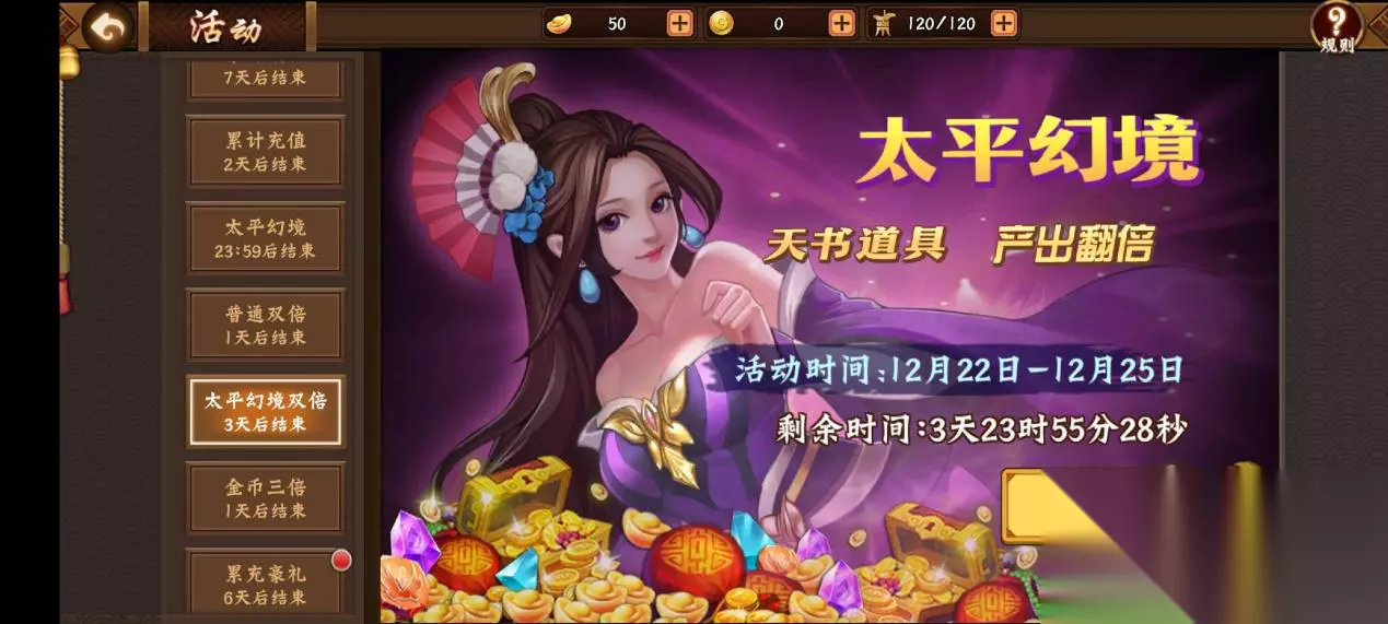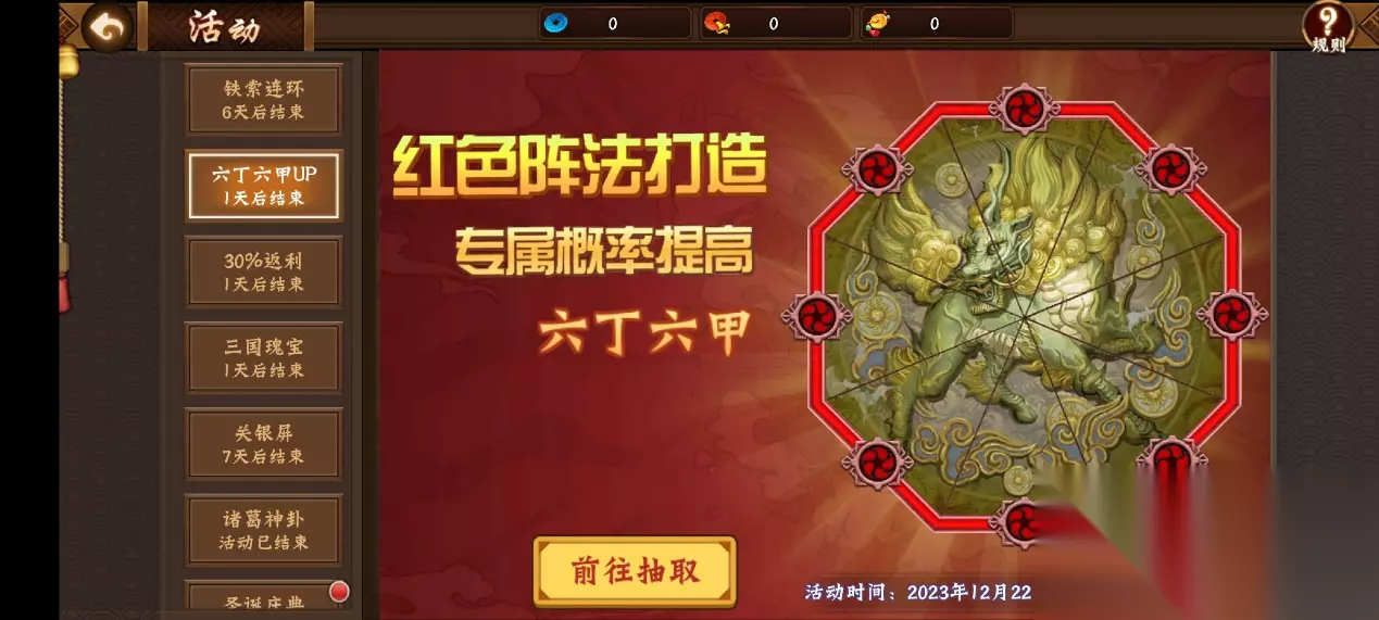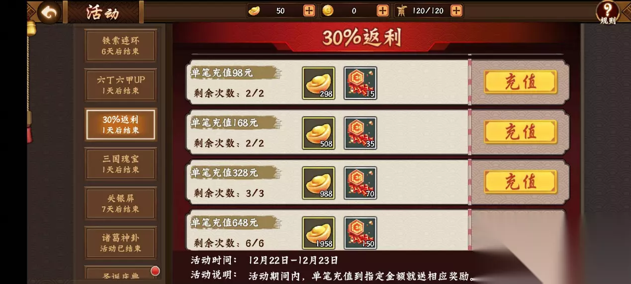 作为副本提升输出伤害的专属阵法,六丁六甲的强大勿容置疑,不仅基础属性全面领先于其他阵法,融会、连珠、归流等效果更是整体上领先于三才的奋力词条。红色五件套带来的无双灵决技能更是可以让玩家在切将或释放技能达到12次之后,使得接下来的8s内技攻和普攻伤害增加125%,不仅极大的提升了大招的伤害,更是可以提升小技能的输出,这是技能输出爆发型武将的绝对大杀器。 12月22日 ~12月23日活动期间内,限时开启“三国瑰宝”活动,消耗“命运钥匙”参与活动有机会获取“金铢币、熔火币”等各类稀缺资源。12月22日~12月23日活动期间内,限时开启阵法打造up活动,期间“六丁六甲阵法”的产出率占红色阵法打造产出的50%。 3、单充返利&充值排行奖励