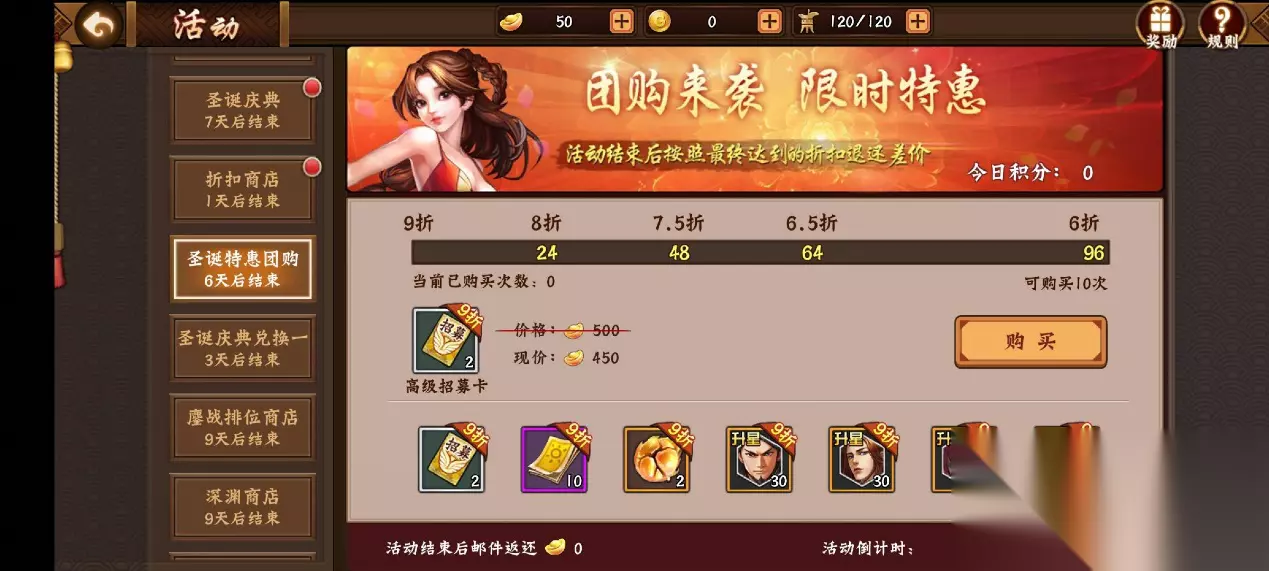 12月22日~12月28日活动期间内,限时开启圣诞团购活动,可在商店中购买各类稀缺道具,全服购买次数越多折扣越低,最低可至6折。本期商品:“高级道具宝券、高级招募卡、战魂碎片、孙策/周瑜/姜维/祝融升星卡”等道具。 三、氪金大佬之专场活动 双旦活动庆典期间,官方也为尊贵的氪金大佬们准备了一大波超值的优惠活动,让玩家们充分体验钞能力带来的美妙感觉,特别穿上关银屏红色双旦传说时装,简直是气场十足啊! 1、奇珍商肆,大佬专享
