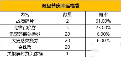 12月22日~12月29日活动期间内,限时出售“庆典礼包”打开可获得“双旦节庆幸运福袋、S任选升星卡、神剑炼器随机箱、青龙饰品碎片四选一箱”等道具,购买达到指定次数可获得“气双旦节庆至尊宝箱、关银屏/无双赵云传说时装、双旦节庆幸运福袋、神剑炼器任选箱”等稀有道具奖励。 攻略组看来,奇珍商肆里面有着当前版本内需求极高的各种游戏资源,青龙饰品碎片和神剑炼器宝箱这两项更是当前比较热门的资源,幸运福袋更是可以获得宠物召唤券、无双张辽&无双郭嘉兑换券、金铢币等宝贵资源,而关银屏和无双两大武将的传说时装,不仅能够带来属性的大幅度提升(关银屏传说时装提升技攻1.5%+ 技防1%,无双赵云传说时装提升技攻1.5%+ 普攻1%),更是大佬们的排面,毕竟史诗皮肤就是氪金大佬的代名词。 2、三国瑰宝/六丁六甲UP