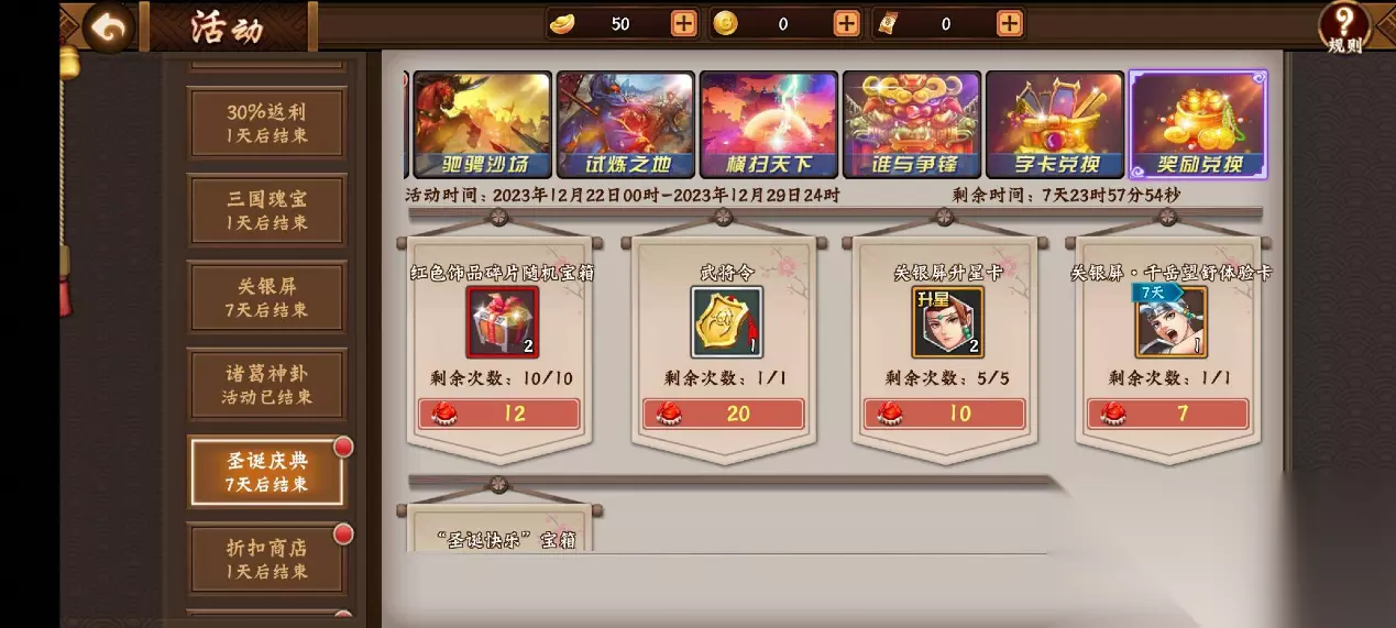 12月22日~12月23日活动期间,单笔充值达到指定金额即可在活动页面额外领取30%比例元宝和限时兑换道具“庆典礼花”,部分档位最多可参与6次,活动期间内可使用限时兑换道具“庆典礼花”在商店内兑换“金铢币、青龙之魂、太史慈传说时装、无双郭嘉限定时装、无双张飞/无双关羽/张春华/司马懿双旦节时装”等奖励。12月22日~12月25日23:00活动期间,充值排名第一名可获得“武圣青龙兵符碎片*100”和“金币”,第二名可获得“武圣青龙兵符碎片*50”和“金币”,第三名可获得“武圣青龙兵符碎片*25”和“金币”,想要获得青龙兵符的玩家不可错过哦。 4、时装商店,神采飞扬 12月22日~12月29日活动期间,时装商店内 “荀彧/无双马超/无双关羽/蔡文姬/祝融”等武将的直购史诗时装限时8折出售、“吕布/诸葛亮/周瑜/陆逊/庞统”等武将的直购高级时装限时8折出售;“黄忠/关羽”等武将的元宝史诗时装限时7折出售、“黄忠/司马懿/小乔”等武将的元宝高级时装限时7折出售。 四、免费福利之人人有份 最后攻略组再给各位主公介绍一下双旦活动庆典期间的一大波福利活动,而大部分活动都是参与并完成就可以获取大量的资源奖励,可谓是参者有份,轻松获得。 1、竞技/副本挑战活动 12月22日~12月29日活动期间,使用“关银屏”排位赛获胜达到指定次数可领取“街机币、关银屏升星卡”等奖励。 12月22日~12月29日活动期间,排位赛获胜达到指定场次可分别领取“街机币、莫邪剑碎片、陨铁”等奖励。 12月22日~12月25日活动期间,通关对应太平幻境难度一副本可领取“玉如意、随机意境(白蓝紫)”等奖励。 12月23日~12月24日 活动期间,参与极限竞技比赛并获胜指定场次可领取“神仙笔碎片、高级招募卡、金币”等奖励。 2、铁索连环 12月22日~12月28日每日9:00-23:00期间,完成“铁索连环”活动指定次数可获得”油灯、宝石精华、宝石碎片“等道具,名列前茅的主公更可获得”高级招募卡、竞技币、大量金币“等奖励。 3、圣诞字卡兑换 12月22日~12月29日,在活动期间内,主公们可以用“圣、诞、快、乐”字卡兑换“陨铁、宝石碎片、战魂残片”等资源。 在活动页面内可用限时道具“圣诞帽”兑换“武将令、关银屏升星卡、红色饰品碎片随机宝箱、圣诞快乐宝箱”等道具,备注:圣诞帽可以在其他活动中获取,字卡可以在普通副本、精英副本、过关斩将、传说战役等副本里获得。 4、收益翻倍