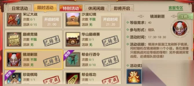 镜湖剿匪打法介绍: 副本条件介绍: 到40级后可以组队去镜湖剿匪,镜湖剿匪是在镜湖场景随机地点刷新的混江龙BOOS,一共15个小匪和一个大匪,玩家都会叫小龙和大龙,因镜湖是野外被杀无杀气的场景,需要组队前往,小匪因随机刷新位置,所以看运气,大匪(大龙)的话最好高战力抢夺,不然很难抢到。
