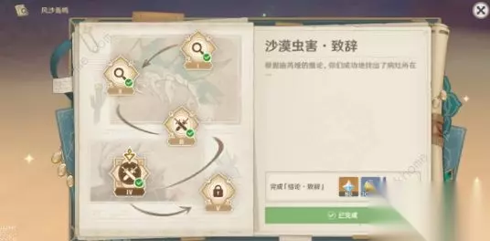 1、将时间调至次日的8点到十二点之间,与两位学者对话,完成沙漠虫害・本论,和维纳亚克对话开启挑战,通过四叶草可以快速的到目地点;
