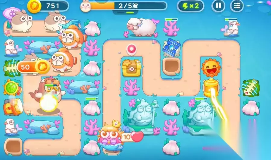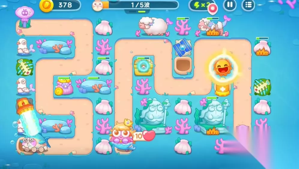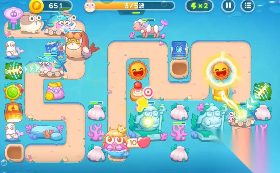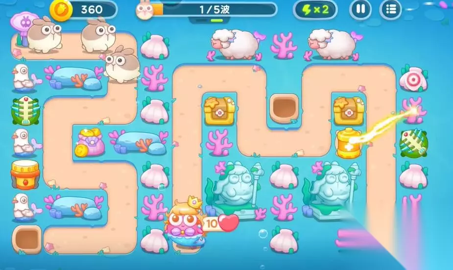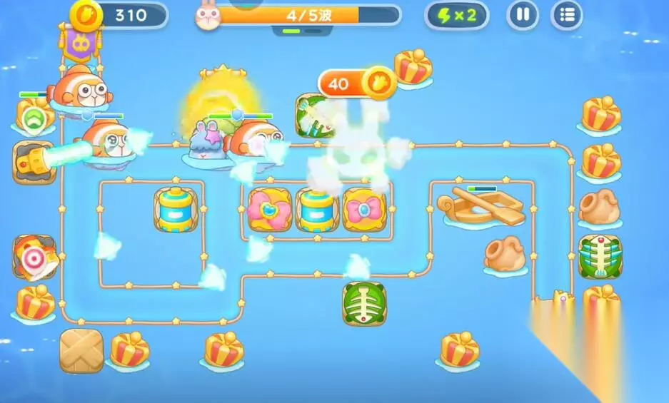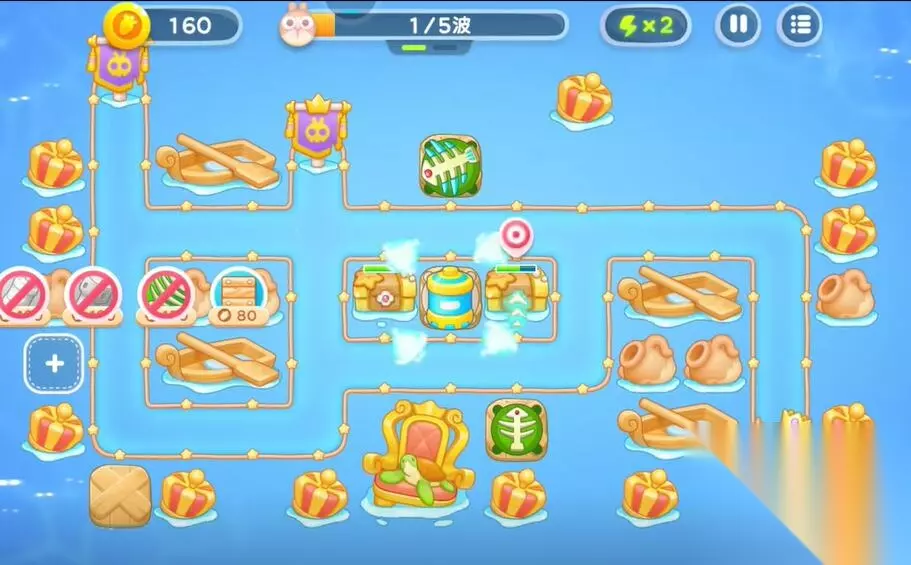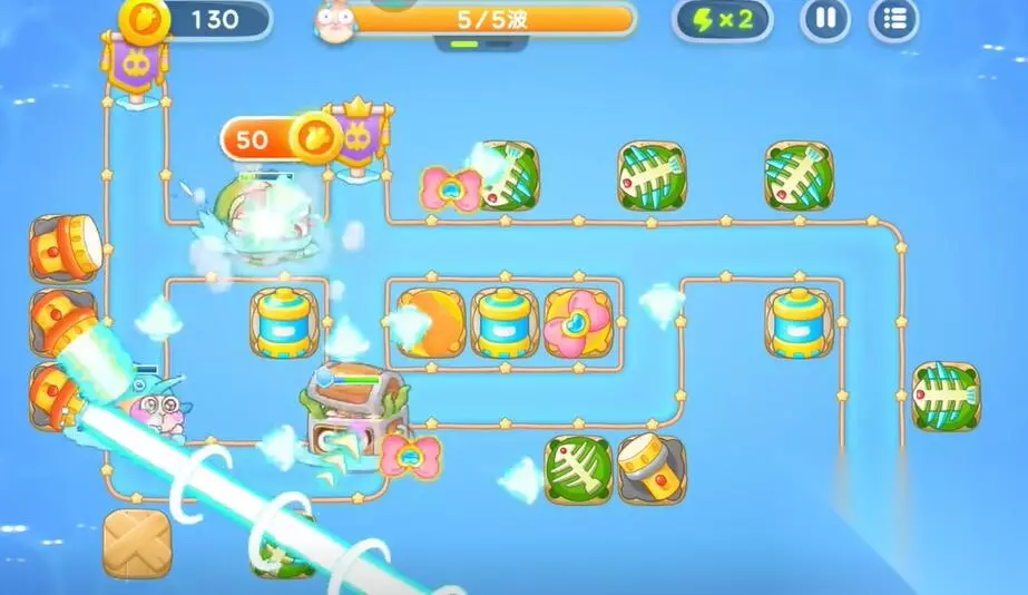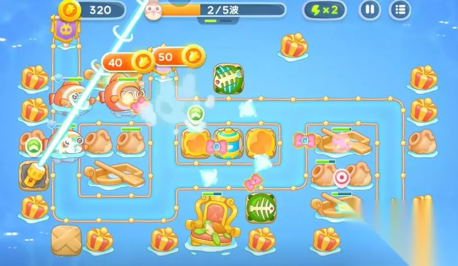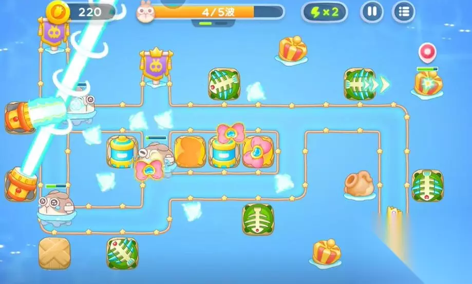 保卫萝卜4海的闺女攻略 保卫萝卜4海的闺女第99关攻略 第一轮: 1、在中间的上方建造鱼骨塔清理中间的礼物。