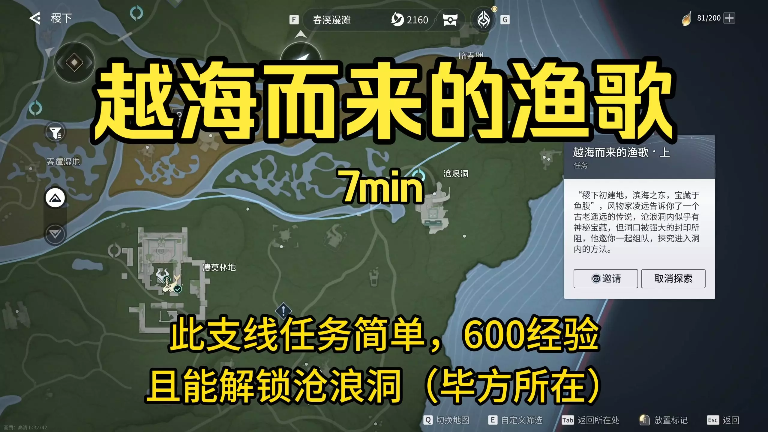 已设置视频章节,请放心食用 若跳过剧情动画,可5min左右完成越海而来的渔歌上下两个支线,得600经验 击败洞中毕方还有经验,属于前期缺经验必做 还有元流之子的…