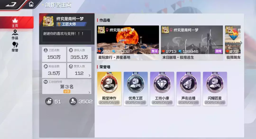 同时,各位工坊创作者不仅能亲手打造地图,还能在主页编辑展示优质作品、在荣誉墙亮出你的专属荣誉徽章!