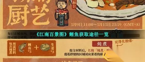 《江南百景图》游戏当中近期开启了母亲的厨艺活动玩法,玩家需要收集生姜和鲫鱼制作红烧鲫鱼在进行炖煮烹饪可以获取到不错的道具资源奖励,前提是我们要把食材收集完整,那么鲫鱼怎么获得呢?下面233乐园手游网小编就给大家整理了《江南百景图》鲤鱼获取途径一览,一起看看吧。 《江南百景图》生姜获取途径一览:点击查看