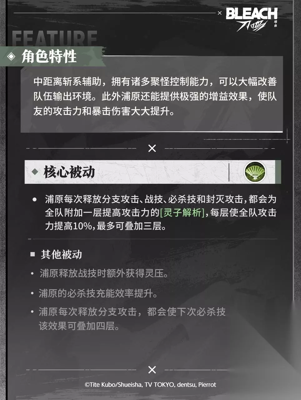 点心店“浦原商店”的店主。暗地里经营着面向死神的各种物品,并协助露琪亚在现世的行动。其真实身份是原十二番队队长兼技术开发局初代局长,曾完成包括“崩玉”开发在内的多项划时代发明,但最终被逐出尸魂界。 游戏中的浦原喜助是中距离斩系辅助角色,战技可以控制并聚集敌人。必杀技在造成伤害的同时还可以提升全队暴击伤害,是斩系队不可或缺的强力辅助。 点击下方图片,一起查看浦原喜助的技能详情吧!*研发中版本,不代表游戏最终品质
