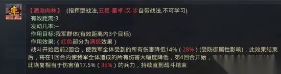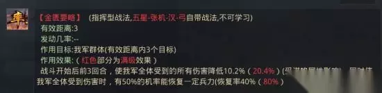 2.降低我军受到的伤害 含此效果的战法有:【金匮要略】、【酒池肉林】、【六宫无怨】、【王佐之才】、【中宫追玺】、【避其锋芒】、【鱼鳞】(仅降低策略伤害)、【形兵之极】、【形兵列阵】。