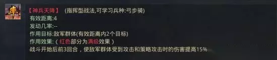4.提高敌军受到的伤害 含此效果的战法有:【神兵天降】。
