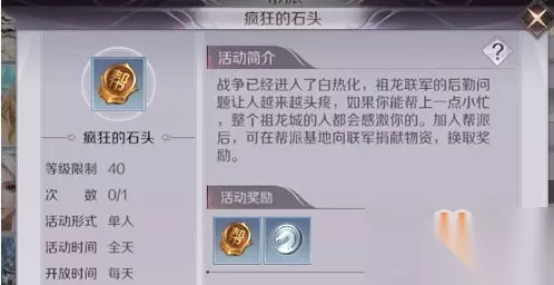 疯狂的石头玩法规则 1.玩家可以在任意时间回到帮派基地找到候人兮参与活动。 2.每装填一种祖龙联军所需的物资可以得到一次奖励。 3.所需的物资可以向其他帮派成员求助,但装填该物资奖励将给予帮助者。 4.确认上交后当日将不能继续装填物资,根据装填的物资数量玩家可以收获祖龙联军给予的不同程度的奖励。 5.装填三种物资可领取第一档奖励,装填六种物资可领取第二档奖励,装填所有种物资可领取第三档奖励。 6.每一档奖励将会累积,所有已达成阶段的奖励都可以领取到。 疯狂的石头获得方法