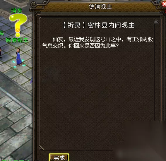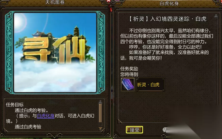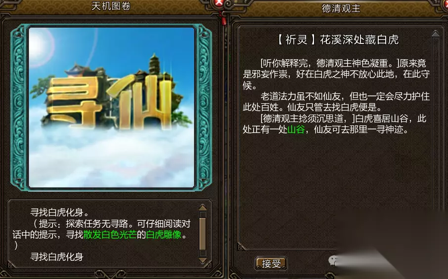白虎任务: 前往密林县找到德清观主,接取任务花溪深处藏白虎,前往花溪谷 (坐标870, 935)找到白虎化身,入幻境完成挑战。 击败大水晶及周围的小水晶即可完成挑战,受到水晶能量释放防御即可,并迅速叠加5层状态,使用大招狂风怒吼,如此往复,完成任务后可获得白虎技能书。
