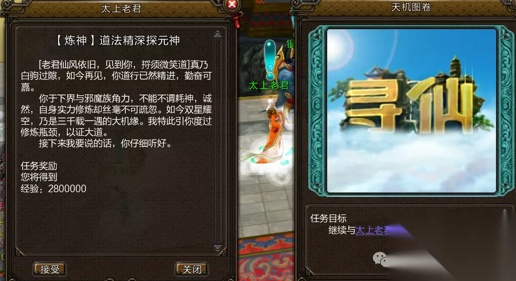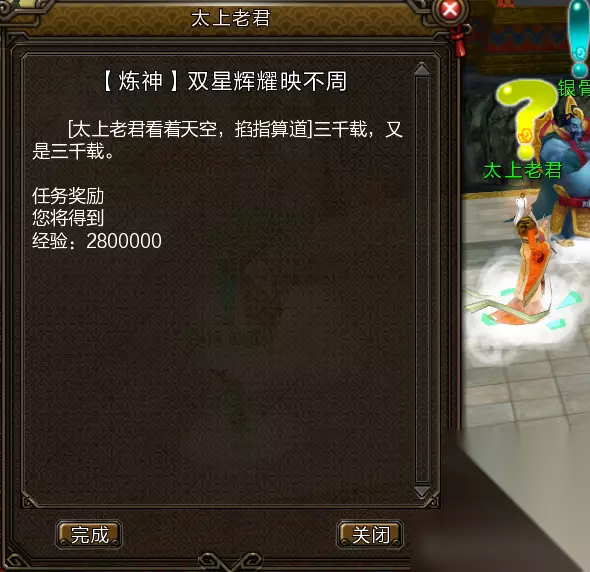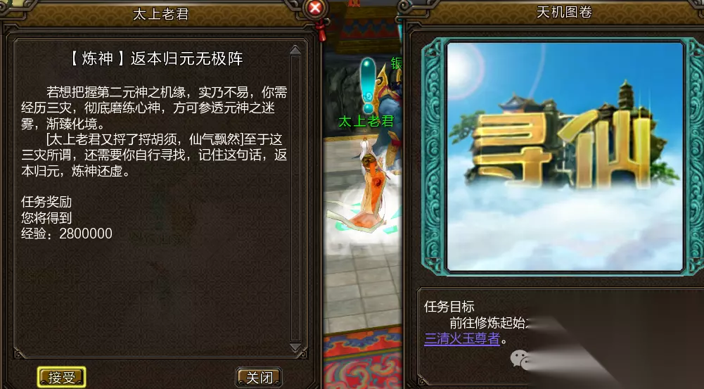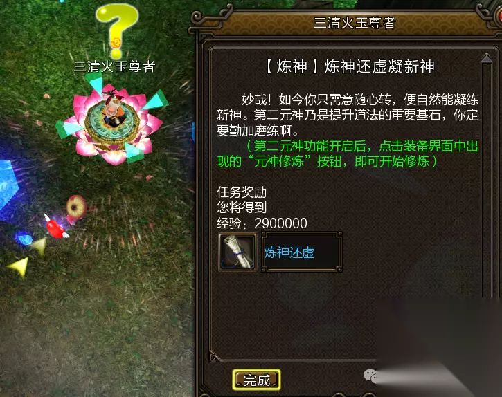 喏~第二元神开启攻略已经备好,请看~ 1任务指引 玩家需达到100级前往白云观NPC玄真子处接取“炼神·双星辉耀映不周”系列任务。 按任务指引前往万仙台寻找太上老君,完成封魔台战斗及小桑村混元无极阵任务后即可开启第二元神。 开启后,玩家可通过切换按键在本体与第二元神间转换,每次切换有15秒冷却时间。 建议第二元神选择非主力职业,以节省属性点道具。