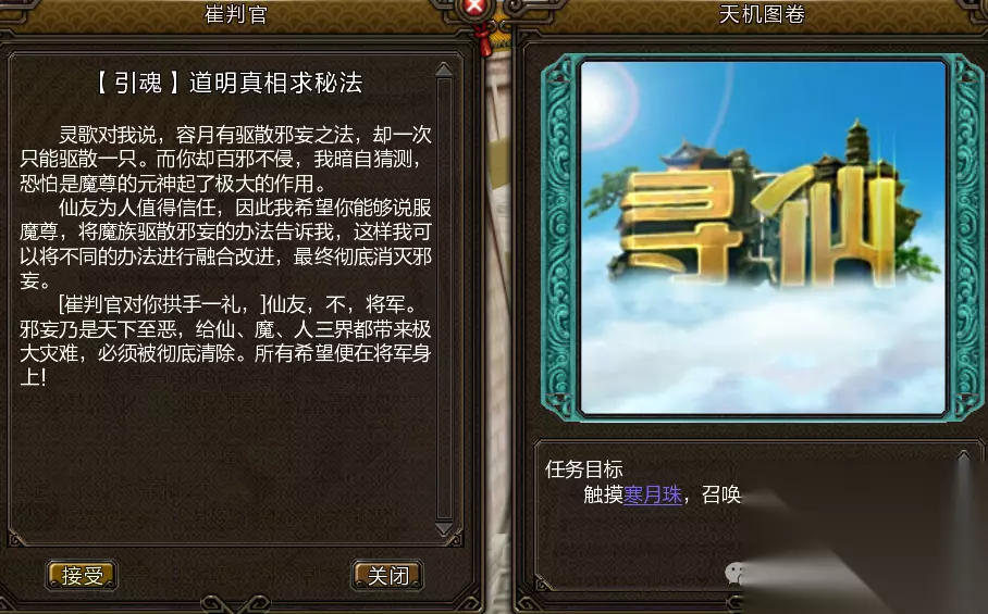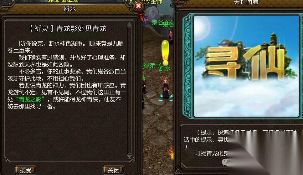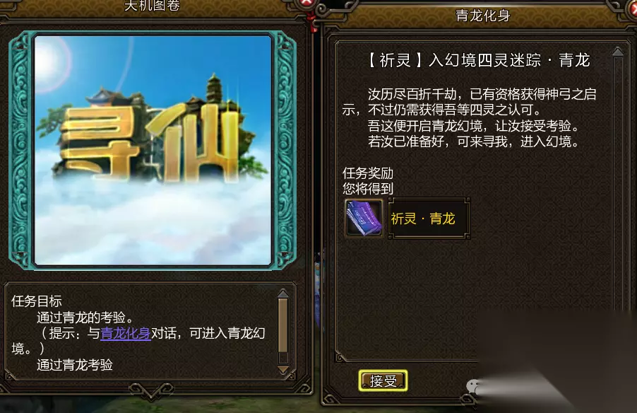 青龙任务: 前往舍身台对断水使用仙派召集令寻找青龙影(460,661)坐标,进入后与大水晶战斗并叠加状态,受到大招攻击时防御即可,叠满5层后使用奔雷云谲击败水晶,即可获得祈青龙技能书。