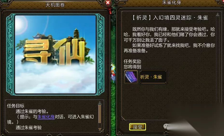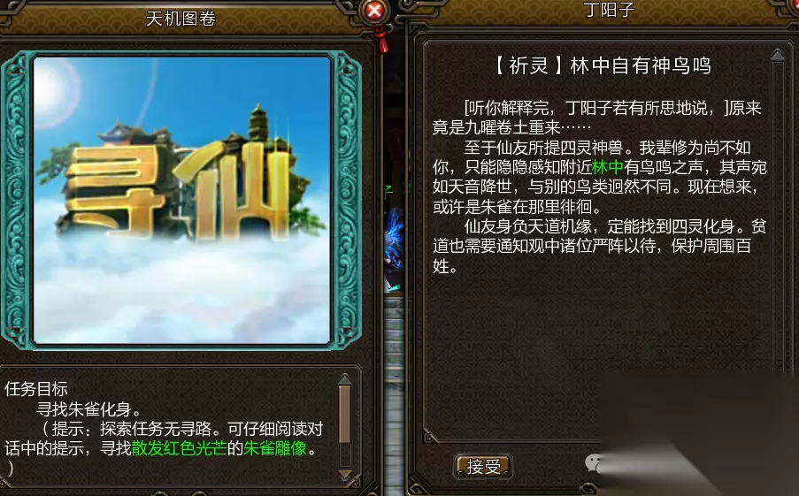 朱雀任务: 前往宁阳观,找到丁阳子对其使用仙派召集令寻找朱雀化身坐标(2512,1559)入幻境完成挑战。 利用大水晶迅速叠加状态,水晶释放能量冲击时防御即可,叠满5层释放大招炎羽流矢,如此往复即可击败朱雀化身。