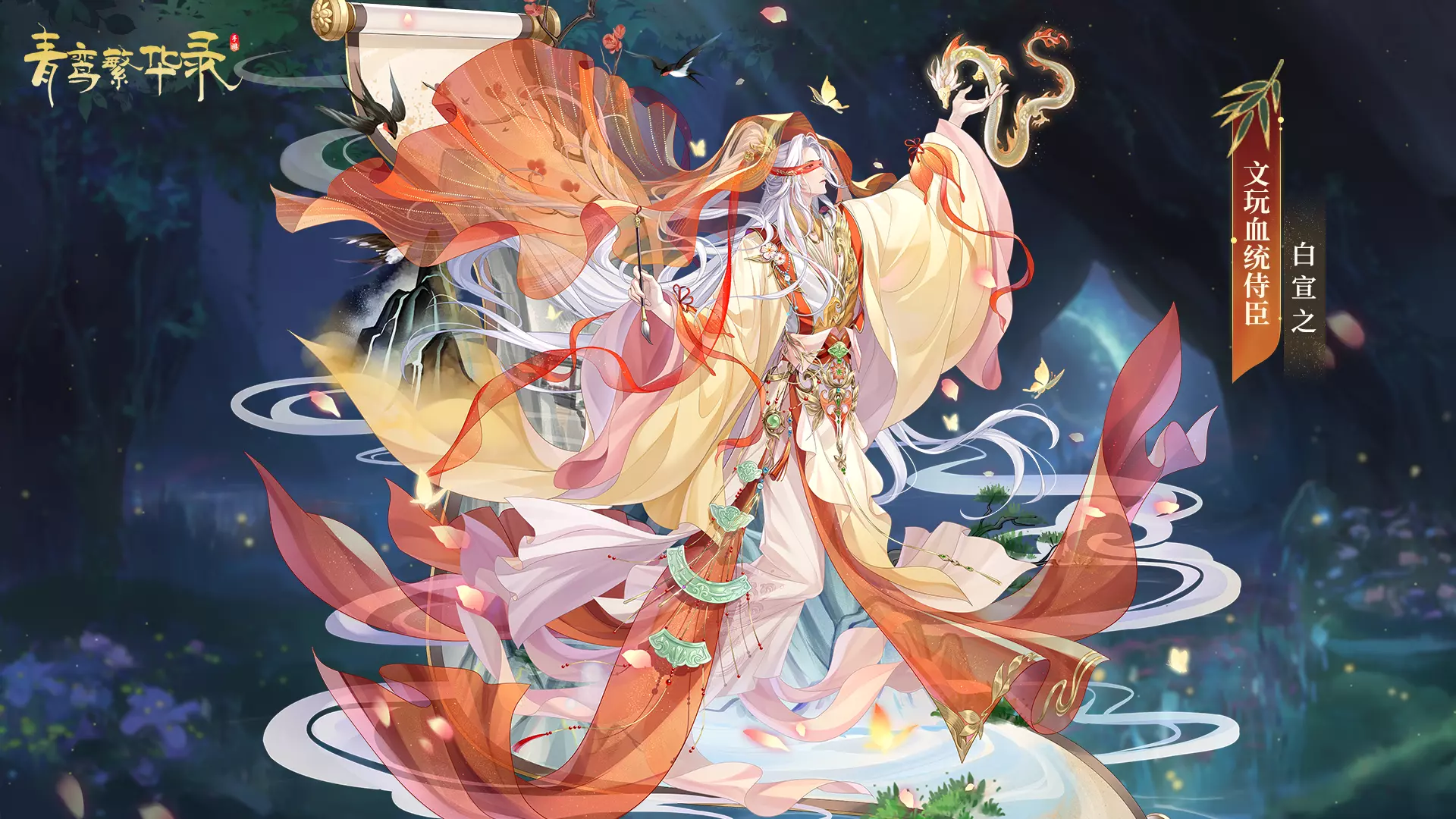 角色介绍:白发墨瞳,总是一袭素衣,长时间来暗中守护藏书阁,不喜聒噪,有些洁癖,最大的爱好是一个人修补古籍。嘴硬心软,每当凤离或墨灵将屋内弄得杂乱,他总会冷声讥讽,再默默收拾整齐。
