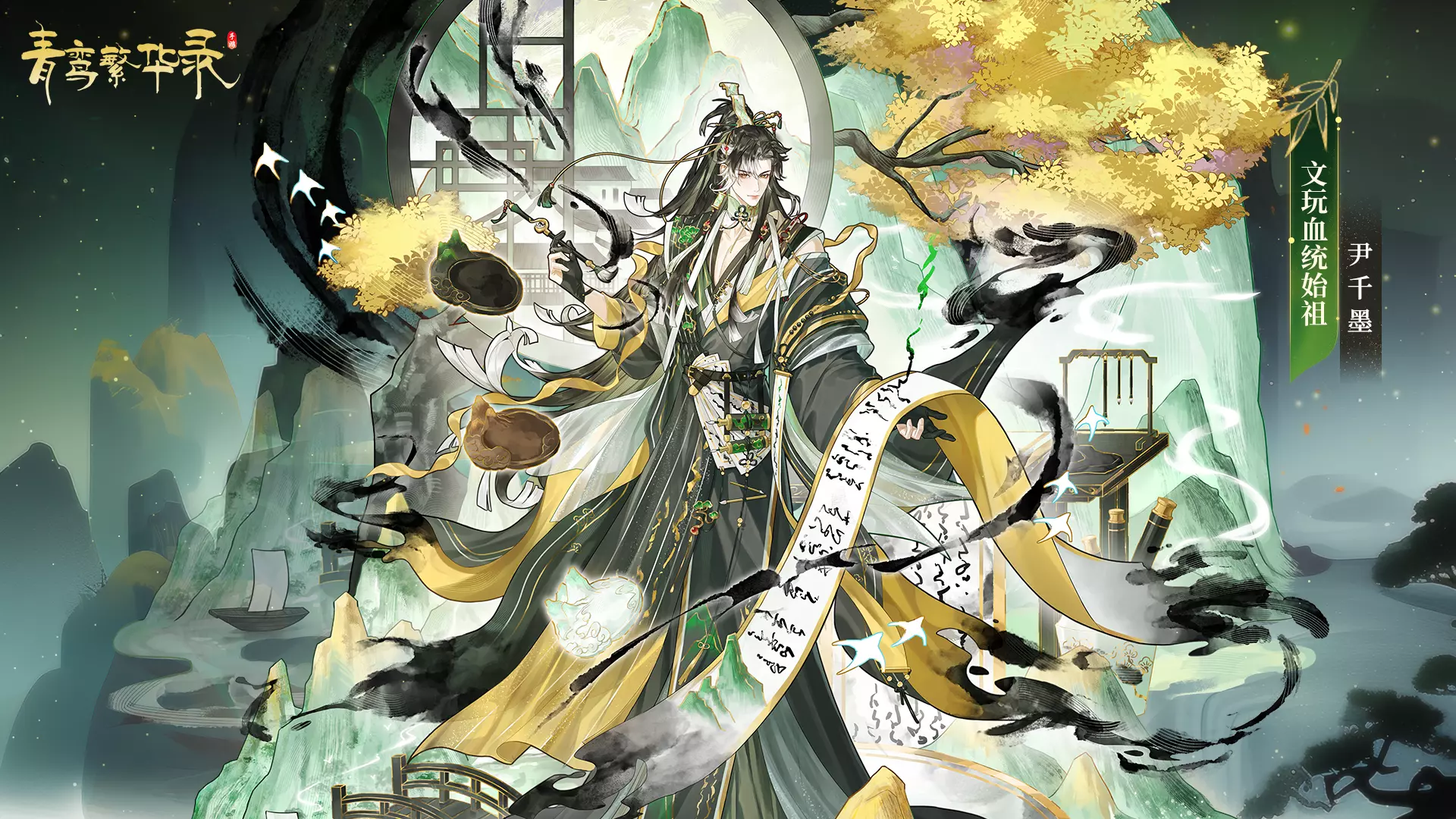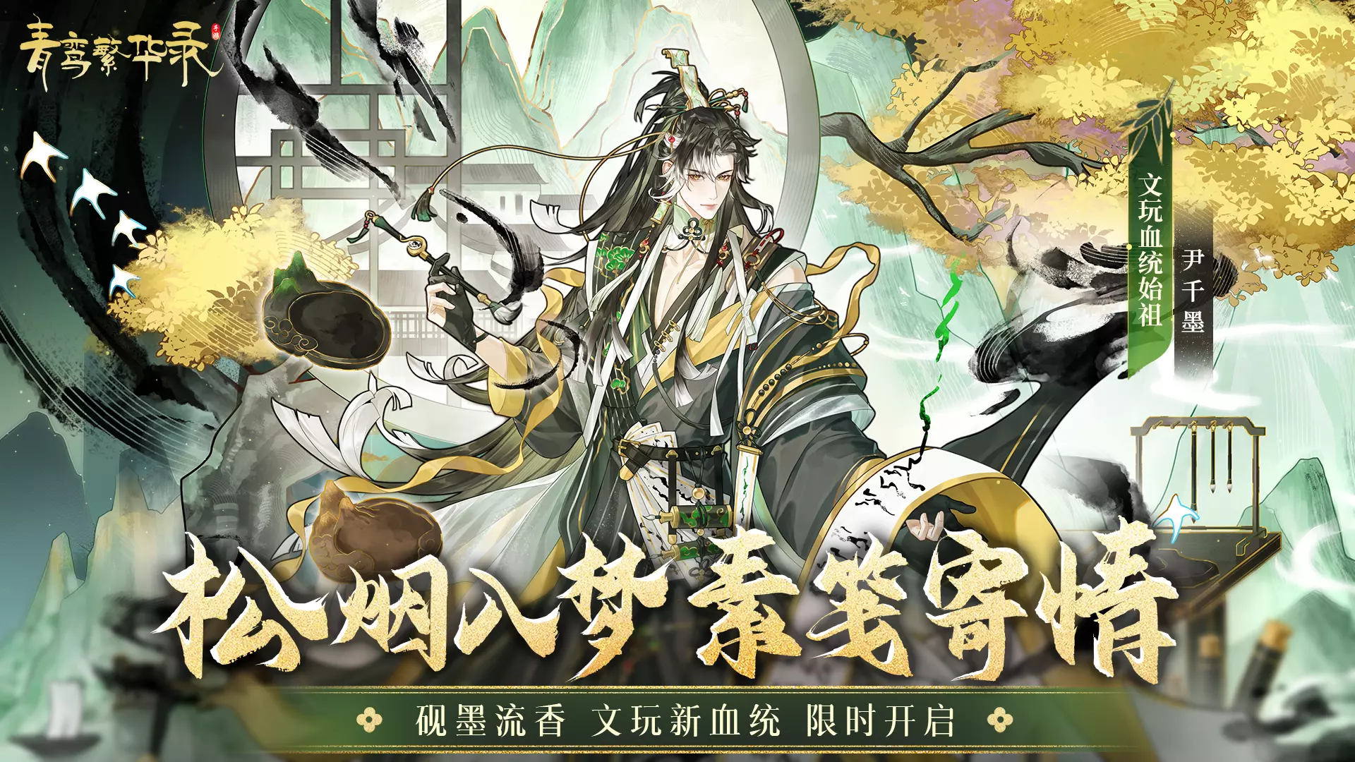 角色介绍:松烟墨化灵而成的狂放画师,洒脱不羁,吐息间带有松烟香。曾游历人间四方,终与凤离相遇。看似洒脱不羁,实则生活简朴,唯以饮酒作画为乐。作画时墨渍常染周身,自己却浑然不觉。