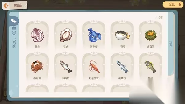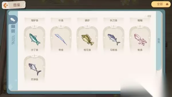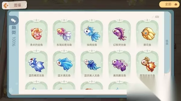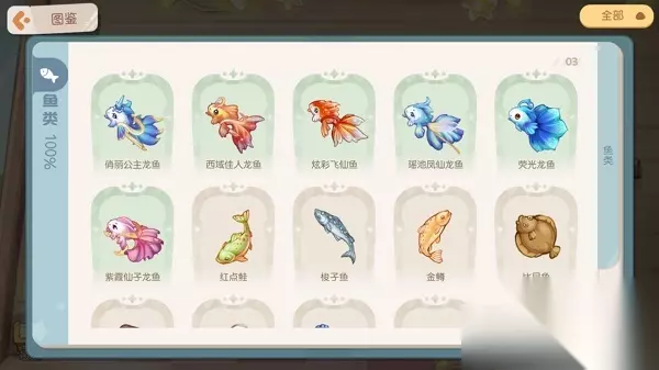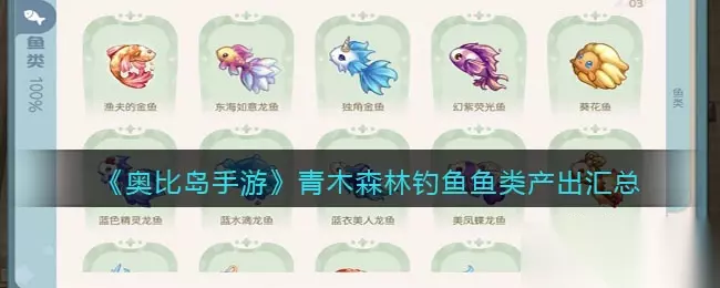 奥比岛手游青木森林钓鱼鱼类产出汇总 青木森林叮咚小溪 在地图中选择前往【青木森林】,到达传送点后往上走就能看到叮咚小溪。 在小溪上、中、下游这三个不同的地段,可以钓到不同的鱼类噢~ 在叮咚小溪上游,可以钓到11种鱼: 普通鱼:红点鲑、梭子鱼、金鳟、红鲷、海鲈鱼、秋刀鱼、鳗鲡;龙鱼:西域佳人龙鱼、幻紫荧光鱼、葵花鱼、蓝水滴龙鱼。(将鱼饵拖动到河流中,不要松开手,就能看到在该河段能钓到什么鱼类) 在叮咚小溪中游,可以钓到11种鱼: 普通鱼:河鲀、面包蟹、赤睛鱼、黑线鳕、针鱼、鱿鱼、炸弹鱼;龙鱼:蓝衣美人龙鱼、美凤蝶龙鱼、俏丽公主龙鱼、炫彩飞仙鱼。 在叮咚小溪下游,可以钓到10种鱼: 普通鱼:墨鱼、蓝龙虾、绿海胆、鳕鱼、金鲳鱼、桂花鱼、马鲛鱼;龙鱼:东海如意龙鱼、南海吉祥龙鱼、紫霞仙子龙鱼。 钓鱼鱼类图鉴 目前海岛上一共有46种鱼,包括拥有华丽外表的龙鱼!大家可以点击下图认识认识它们~