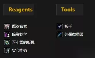 需要工具:侏儒微调器、扳手 需要素材:魔纹布卷x4、暗影蛛丝x2、不牢固的扳机x1、实心炸药x4 学习等级:工程学225 学习自:由图纸降落伞披风学习,图纸由40-45级左右的小怪掉落。 更多攻略推荐 想要了解更多关于魔兽世界工程学攻略的玩家可以点击右边的链接>>>《魔兽世界怀旧服》工程学大全