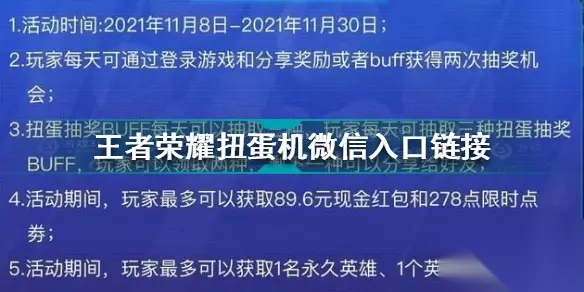 王者荣耀扭蛋机活动 王者荣耀扭蛋机活动可以说是千呼万唤驶出来,预热了好多天终于来了,那么王者荣耀扭蛋机活动的规则和时间你们知道吗?下来由小编来给细细讲解讲解 1 、扭蛋机活动的活动时间是20021年11月17日开始截止于2021年11月28日 2 、如何获得抽奖机会 (1)每日登录游戏即可获得一次抽奖机会 (2)每日分享奖励/BUFF也可获得抽奖机会 每个账号每天最多获得两次抽奖机会 3 、玩法规则: 点击扭一扭的按钮即可抽取扭蛋机奖励,但是建议在扭蛋之前先点击红色的那个按钮增加BUFF,增加BUFF之后在抽奖就可以获得不同程度的增益,可能你就更容易得到你想要的了。 王者荣耀 王者荣耀在2015年11月26日在安卓 、iOS两大平台上正式上线进行公测,是一款竞技对抗类手游,对抗竞技分为1V1 、3V3 、5V5等几种玩法,还可以进行冒险模式和闯关模式,也是一款推塔类的游戏。 一经上线,广受人们好评,各个小视频平台,各大游戏主播纷纷对这款游戏进行各种测评,各种游戏攻略以及人物教学讲解。 王者荣耀人物也是多种多样,其中分为坦克 、战士 、刺客 、法师 、射手 、辅助这六类英雄,人物设计也非常符合国民标准,诸葛亮 、李白简直是小编心目中的二次元男神,帅气儒雅,美丽的貂蝉,温柔的大乔,俏丽的小乔,霸气的芈月更是让人着迷。 王者荣耀扭蛋机活动玩法真的太热烈了吧,目前参与的人数超级多,如果遇到官方活动人数太多进不去的话,你可学习这里的方法快速进入到游戏中的呢,其中用微信的方法还是很不错很优秀的,活动特别的多,一起参与这官方活动吧,你绝对会沉浸其中的。 王者荣耀扭蛋机活动进不去怎么办?王者荣耀进入扭蛋机的方法介绍 活动入口:点此进入 王者荣耀扭蛋机微信快速参与方法 1.微信的玩家们想要参与活动的话就只能够点击链接参与 2.首先找到该活动的连接,把这个连接发给微信好友 3.然后在聊天界面打开,然后登陆微信账号,有时候会自动登陆 4.登陆之后就能够像qq区用户一样自由的抽取了! 王者荣耀扭蛋机概率一览 分享一个限时点券双区活动,两个大区都可以参加,活动很简单。大家参与活动即可领取限时点券,在游戏中心可以看到一个扭蛋活动,每次扭蛋都有概率活动限时点券,最多可以获得278限时点券。而且还有概率获得永久皮肤,虽然说不是很多,不管多少都是赚的。 你好,你是想问超级扭蛋怎么抽吗?超级扭蛋抽的方法是: 1 、打开《王者荣耀》,在活动里找到超级扭蛋。 2 、在页面里点击全英雄皮肤,点击抽奖。 3 、完成任务获取抽奖次数,点击抽奖即可获得扭蛋奖励。超级扭蛋是《王者荣耀》推出的一个活动,可以进入活动在活动页面点击全英雄皮肤并抽奖。 王者扭蛋机进不去是由于网络问题导致的,按照以下步骤重试即可。 工具/原料: oppoA52 Android10 王者荣耀3.63.1.5 1 、打开王者荣耀游戏,点击进入活动。 2 、在活动界面向下滑动到底部。 3 、点击进入音乐扭蛋。 4 、即可成功进入音乐扭蛋机活动。 王者荣耀新皮肤霸王丸即将上线,对此王者荣耀官方又推出了一波新皮肤抽奖活动,那么在王者荣耀新皮肤抽奖活动中都有哪些奖励呢,另外王者荣耀新皮肤抽奖活动网址是什么呢,下面一起来看下吧。 微信区需要完成一个小任务,才可以参加抽奖活动,这个任务对任何人都没有难度。12月13日之前,在实战中击杀三个英雄即可完成任务,然后就能参与抽奖了,但每个账号只能抽一次。 活动入口:微信——发现——游戏——王者荣耀专区——中间的热点活动 手Q区也需要达成一定的条件,不过难度也很低,邀请五个好友进入活动页面,然后就可以参与抽奖了,每日可抽一次,最多可抽五次,活动结束时间依旧是12月13日。 活动入口:手Q——动态——游戏——王者荣耀专区——全部福利——活动——宫本武藏新皮肤活动 王者荣耀的抽奖活动都是重在参与,保持平常心参加即可,抱着必中的心理肯定会失望的。既然是抽奖,自然不会出现100%抽到永久英雄或永久皮肤的情况,不过最低也有一个安慰奖:铭文碎片*10。 以上就是王者荣耀新皮肤抽奖活动的相关信息了,希望大家都能抽到自己喜欢的皮肤。 以上就是关于王者荣耀扭蛋机的入口究竟在哪里?全部的内容,如果了解更多相关内容,可以关注我们,你们的支持是我们更新的动力! 【小编推荐】专区入口 || 视频站入口 || 体验服申请入口 || 全民竞猜赢好礼 【新英雄爆料】| 司马懿 || 瑶 || 孙策 || 新英雄:囚徒/书圣/瞬 | 【新皮肤爆料】| 李白团战皮肤:敏锐之力new || 诸葛亮团战皮肤:掌控 || 典韦穷奇皮肤 Hot!! | 王者荣耀最新攻略 赛季段位继承表 每日一题 边境突围玩法攻略 体验服爆料