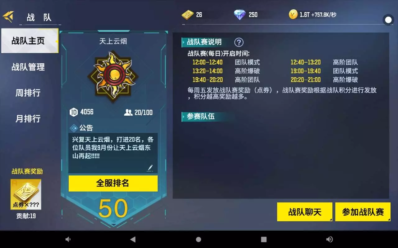 现在战队都落后了😔😔😔是刚回归以前是20几名,没看好给职位全给我踢,我在这里诚信邀请大家加入一起努力争回以前的荣誉