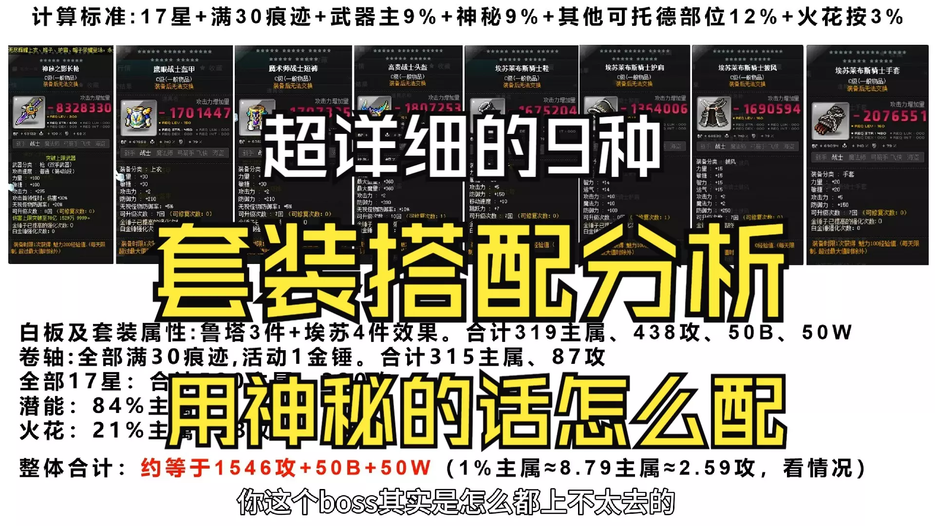 补充一下之前忘记考虑的。如果全神秘的话。数据是63%潜能、1241主属、1054攻击力,换算合计1584攻击力,60BOSS、65无视