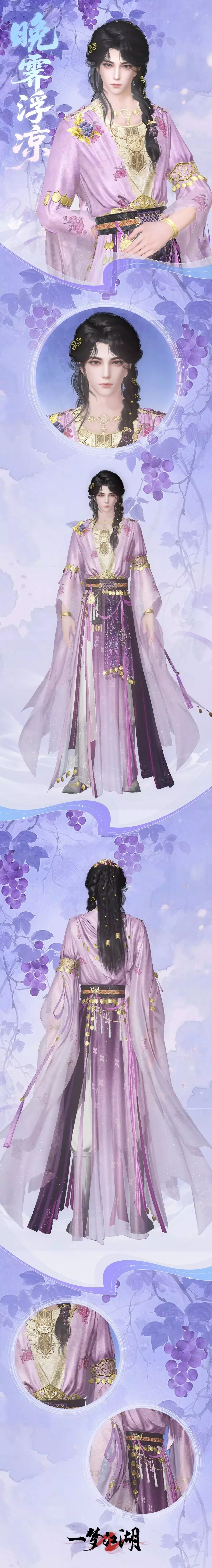 男款锦袍织就暗纹葡萄卷须,外罩绛纱长衣透出襟口葡萄纹样,腰间革带叮咚,垂下流苏皆染暮云灰紫。袖口处缀黄玉珠粒,恍若破碎夕照凝成的甜醴,长发束于脑后,额前散落几缕发丝夹缠紫葡萄,就让这富饶的秋日为少侠理发裁衣。