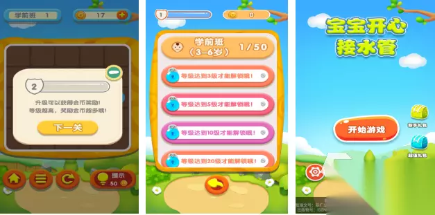 游戏的场景比较丰富细致,每一个场景都会有独特的特色。只需要轻轻的触控屏幕就能完成一系列的操作,上手比较容易,不过关卡在设计时会有较大的难度。游戏中还会有很多的道具,还有奖励,玩家一旦在完成任务之后就可以得到金币,到了后期就可以解锁装饰品或者是水管。此外在游戏中还会有排行榜玩法。 高速下载 普通下载 2、《宝宝开心接水管》