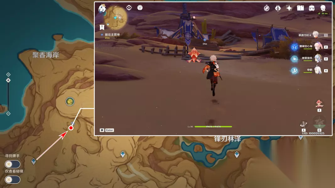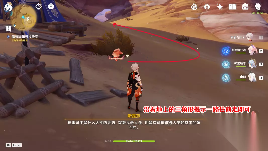 5 循着脚印寻找线索/与愚人众长官对话/击退敌人 但按着时间过去以后,我们还是没有找到那个愚人众长官,只能顺着脚印寻找线索了。这里我们沿着营地附近的三角形小箭头标记走即可。