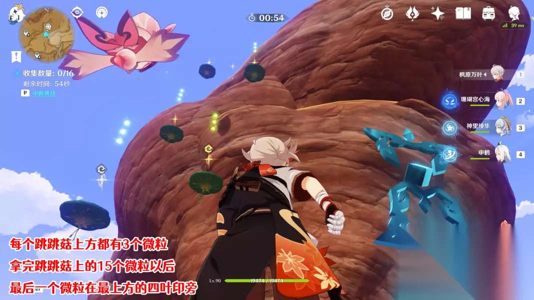 开启这个限时挑战后抬头往东边高处看,这个挑战需要我们在60秒内拾取16个微粒,这里每个跳跳菇上方都有3个微粒,通过四叶印飞过去以后在跳跳菇上跳一下即可拿到,前15个微粒拿完以后,最后1个微粒就在崖顶的四叶印旁边。
