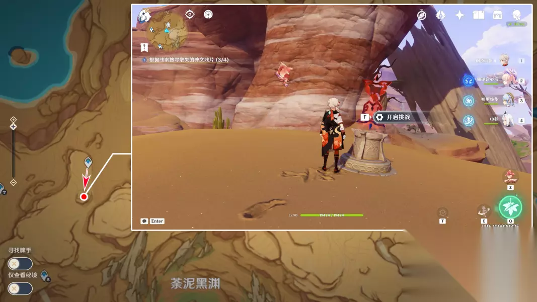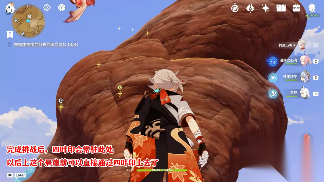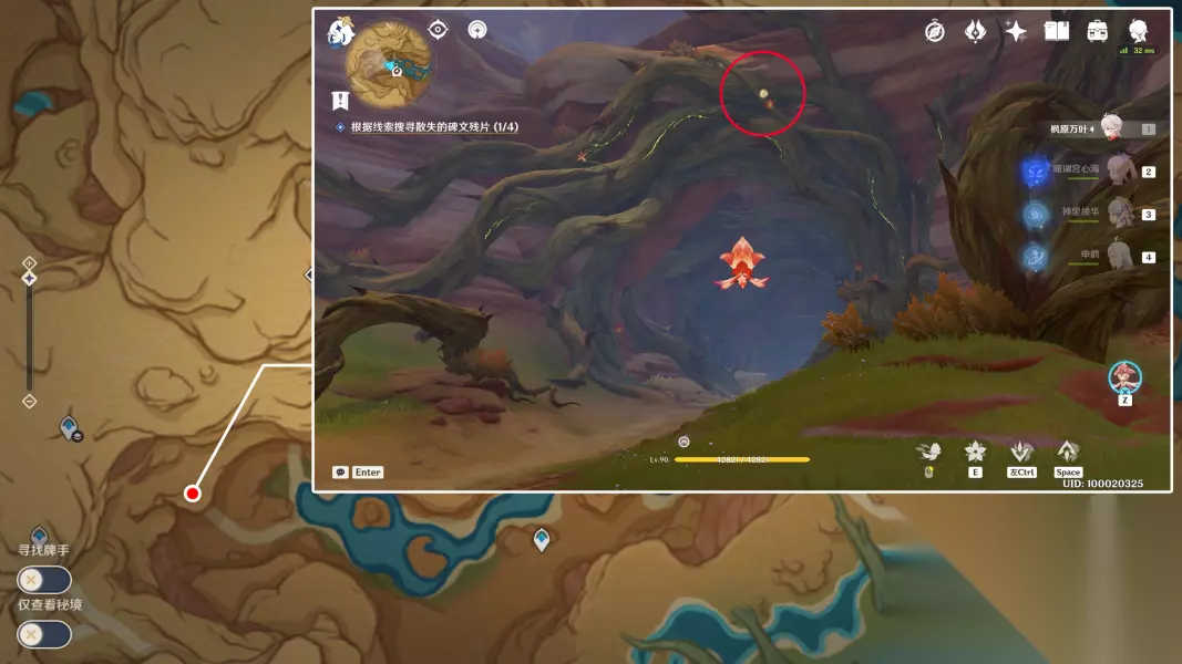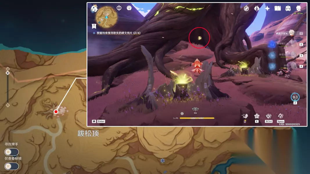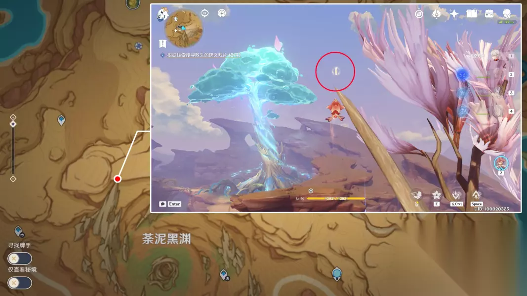 关于第4个碑文残片这里额外说一下,因为这颗树非常高,所以如果不先到悬崖,而是直接站在底部操控斯露莎的话,是没法飞到这么高的。所以这里给各位旅行者介绍一下如何快捷登上这里的悬崖。 首先从图示位置的传送锚点出发,向南边看,通过四叶印飞到这里的岩石上,上面有一个限时挑战:
