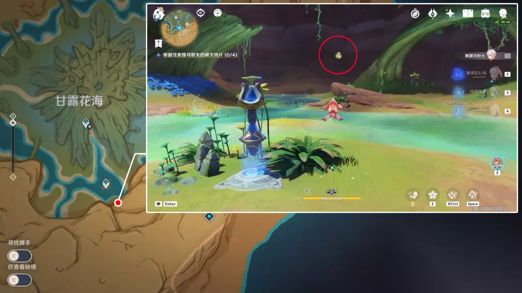 碑文残片1:位于甘露花海图示位置的石块上方。传送到旁边的锚点后,直接切换出斯露莎飞过去靠近即可获得。