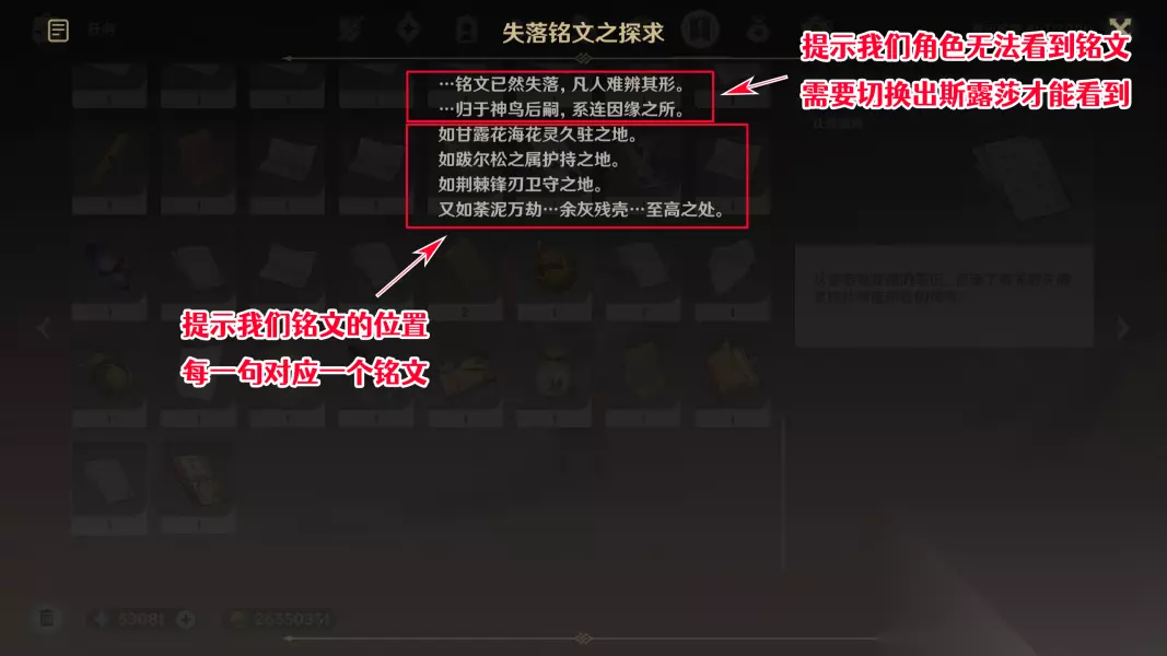 6 根据线索搜寻散失的碑文残片(共4处) 解决了愚人众长官后,接下来我们就可以去寻找散失的4个碑文残片了,之前索希交给我们的笔记「失落铭文之探求」就是重要的线索。 笔记的前两行是在提示我们铭文在操控角色时不可见,需要切换出斯露莎才能看到;后四行则是在暗示碑文残片所在的地点。