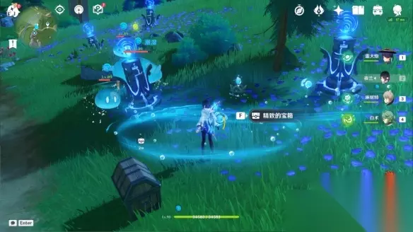 2、激活风车机关后会出现元素颗粒,全部收集齐后可以获得一个精致的宝箱,开启宝箱后触发剧情。