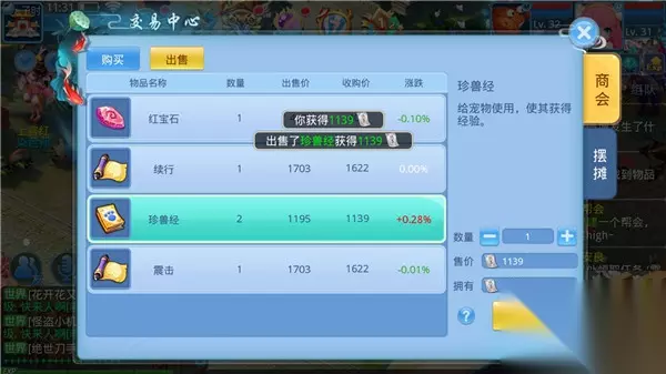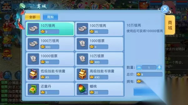 【银票】 这游戏的主要货币之一,主要用于装备打造材料够买、装备宝石购买、宠物宠物技能购买、人物饰品购买、修炼丹购买等等,基本上提升能力道具购买都需要用到银票;那么怎么赚银票呢? 1、藏宝图----每天必做,任务自动战斗,每天15张宝图,主要的银票来源之一。 2、副本----为奖励而生,每种副本每天可以奖励1次,超过副本等级+20则无奖励,每天必做。 3、封妖----封妖时候会掉落装备制造符、宝石等物品,可以出售获得银票,战斗奖励,每天都可以做做看。 4、限时活动----每天限时活动基本上都会有银票道具掉落,可以出售获得银票,主要的银票来源之一,每天必做。 5、交易中心出售道具----平时获得的银票道具出售给系统,获得银票。 6、积分兑换----不管是行侠仗义、竞技场、群雄逐鹿等活动,都可以获得积分奖励,在人物积分兑换界面可以兑换银票道具,出售给系统兑换银票,日积夜累积分是很多的。 7、商店兑换----这个简单粗暴,可以充点小钱在商城购买银票。