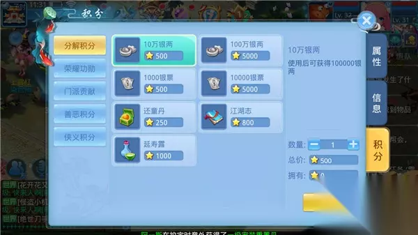【积分】 游戏中的积分有好几种,分解积分、竞技功勋、门派贡献、善恶积分、狭义积分,积分可以兑换道具;那么积分怎么获得呢? 1、分解积分----分解道具,都可以获得积分。 2、门派贡献----每完成一次门派任务,都可以获得门派贡献。 3、竞技功勋----参加限时活动三国竞技场、群雄逐鹿可以获得竞技功勋。 4、善恶积分----40级以上玩家带领至少2个40级以下新人进行封妖或野外战斗可以获得善恶积分。 5、侠义积分----40级以上玩家带领至少2个40级以下新人进行平乱可以获得狭义,帮助他人完成剧情或战役战斗也可以获得2点侠义积分。