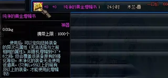 纯净的黄金增幅书和纯净的增幅书之间的区别 纯净的增幅书:只能给强化+0的装备强行赋予指定的红字属性,使用后装备增幅等级为+0。