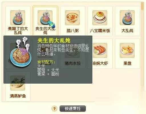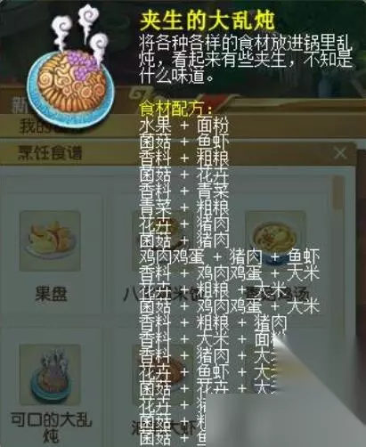 28、夹生的大乱炖 食材: 水果+面粉 菌菇+鱼虾 香料+粗粮 菌菇+花卉 香料+青菜 青菜+粗粮 花卉+猪肉 菌菇+猪肉 鸡肉鸡蛋+猪肉+鱼虾 香料+鸡肉鸡蛋+大米 花卉+粗粮+大米 香料+粗粮+猪肉 菌菇+鸡肉鸡蛋+大米 香料+大米+面粉 香料+大米+猪肉 花卉+鱼虾+大米 花卉+菌菇+大米 花卉+猪肉+大米 菌菇+粗粮+鱼虾 菌菇+面粉+鱼虾