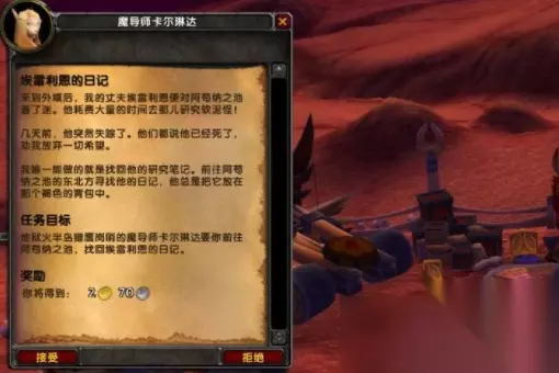 在魔兽世界游戏中,有很多玩家找不到埃雷利恩的日记在哪,其实埃雷利恩的背包就在地狱火半岛,地点坐标(40.0,37.2)中有日记,或者杀死起泡的软泥怪有概率掉落背包,任务做法如下: 1、玩家在猎鹰岗哨与魔导师卡尔琳达对话接受埃雷利恩的日记任务。