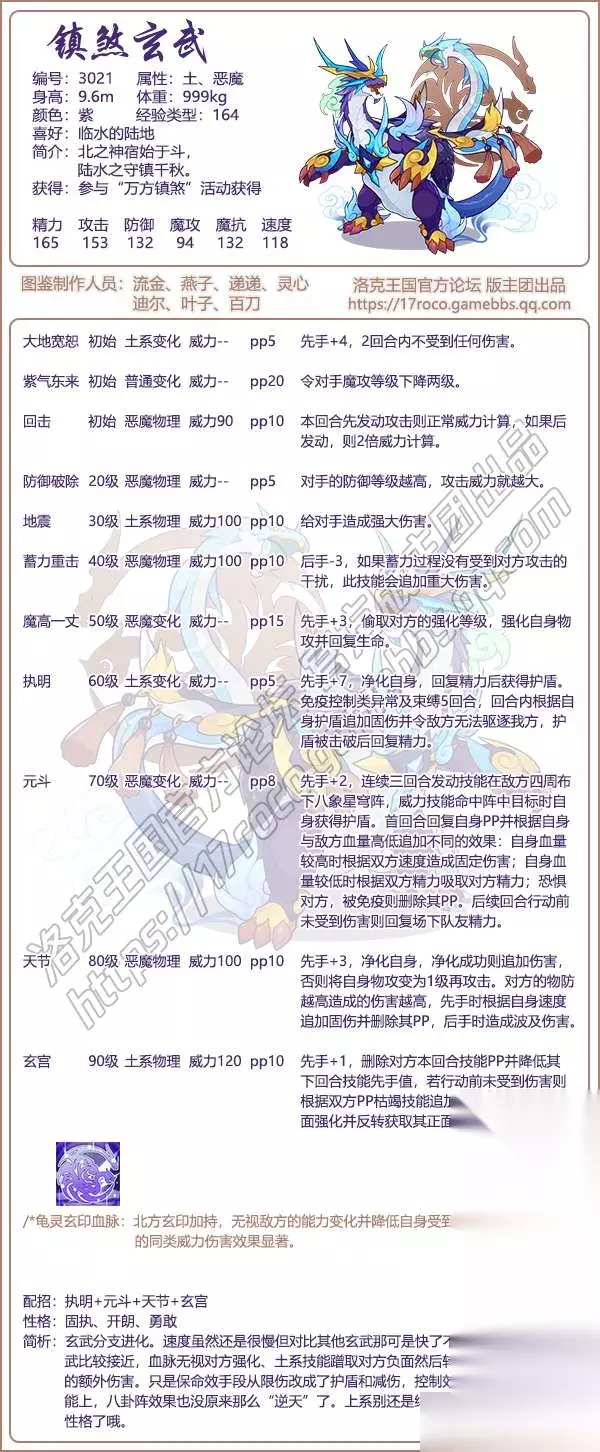 《洛克王国》镇煞玄武技能表图鉴 镇煞玄武 编号: 3021 属性:土、恶魔 身高: 9.6m 体重: 999kg 颜色:紫 经验类型: 1 64 喜好:临水的陆地 简介:北之神宿始于斗,陆水之守镇千秋。 获得:参与“万方镇煞”活动获得